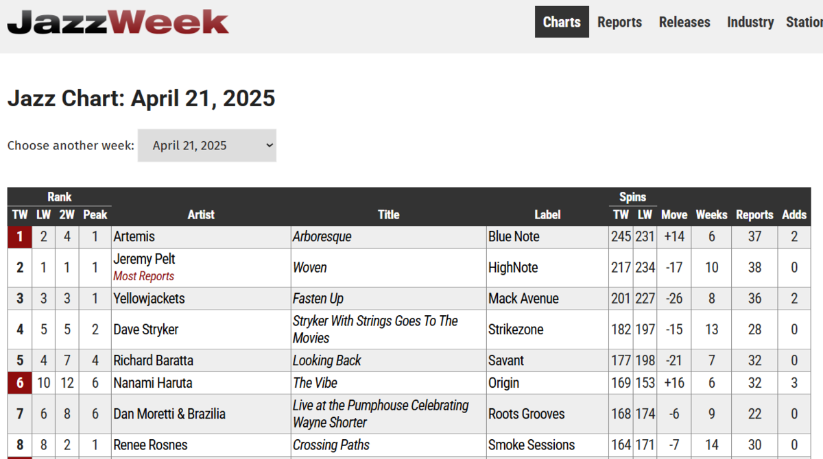 アメリカのジャズチャート「JazzWeek」2025年4月21日付のランキング
